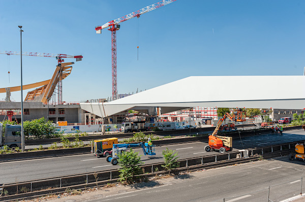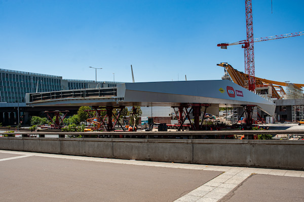 Au cours d’une fermeture exceptionnelle de l’autoroute A1 de 54 h, du lundi 8 août 22h au jeudi 11 août 4h, la passerelle qui doit relier le Stade de France au futur centre aquatique olympique a été ripée au-dessus de la voirie. Une opération d’ampleur, sous maîtrise d’ouvrage métropolitaine, essentielle pour donner forme aux sites olympiques.