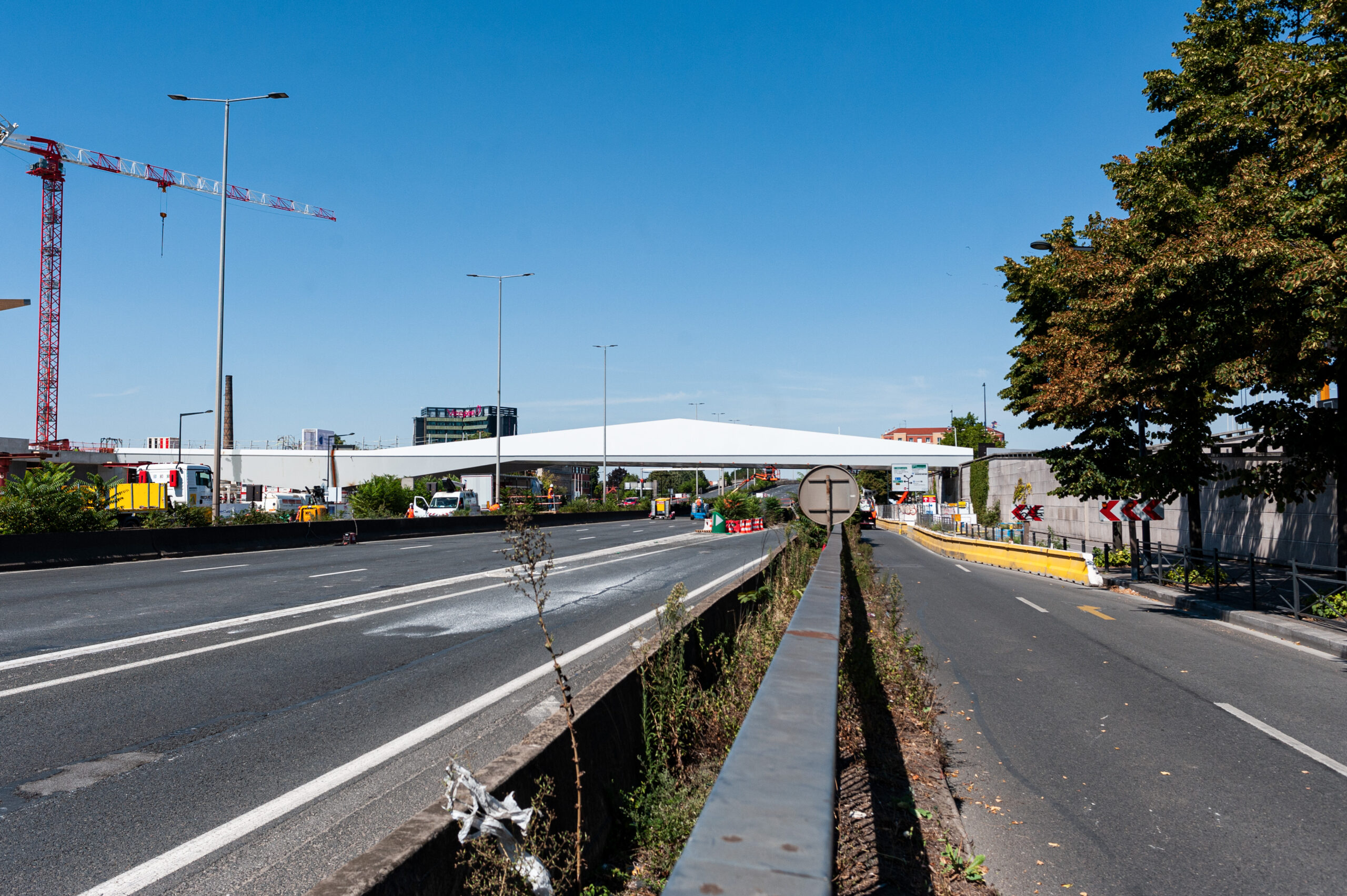 Pour installer cette passerelle tout en acier de 20 m de large par 80 de long, la coupure totale de l’autoroute A1 pendant 54 h a été nécessaire. Une mesure « exceptionnelle » à en croire le président de Plaine Commune et maire (PS) de Saint-Denis (Seine-Saint-Denis) Mathieu Hanotin, rappelant que même pour sa couverture en 1998 l’autoroute n’avait pas été fermée aussi longtemps. Si le temps nécessaire au mouvement de l’ouvrage, porté par des remorques modulaires autopropulsées dont la vitesse de pointe à vide ne dépasse pas les 5 km/h, est long, il a fallu également prendre le temps de déposer les candélabres et la signalisation au niveau du nouveau franchissement. Un travail important mené de nuit, selon la Direction des routes d’Ile-de-France (Dirif).