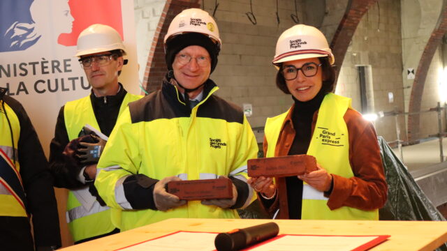 La ministre de la Culture Rachida Dati a effectué ce lundi 24 novembre une visite du chantier de la future gare de La Courneuve Six routes du Grand Paris express. Aux côtés de Jean-François Monteils, président du directoire de la Société des grands projets, la candidate LR à la mairie de Paris a signé une convention de partenariat avec la SGP consacrée à la commande artistique et à l'architecture.