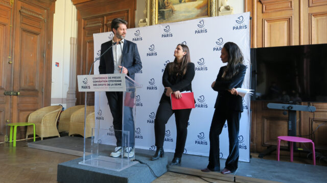 Anouch Toranian et Pierre Rabadan, respectivement adjointe à la maire de Paris en charge de la vie associative, de la participation citoyenne et du débat public et adjoint en charge du sport, des Jeux olympiques et paralympiques et de la Seine, ont présenté, vendredi 4 avril 2025 à l’Académie du climat, le déroulement de la convention citoyenne des droits de la Seine, qui débute ce week-end du 5 et 6 avril 2025.
