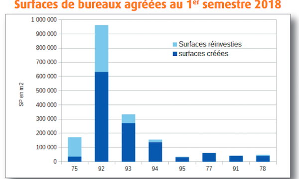 1,8 million de m2 de surfaces de bureaux ont été agréés au premier semestre 2018 en Ile-de-France, rapporte la DRIEA. Un record dû notamment à cinq projets à La Défense.