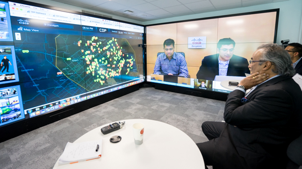Deux écrans géants, du café et le top management monde de Cisco. A Issy-les-Moulineaux, dans les étages du site français de la firme, qui se présente comme le leader mondial de la transformation numérique, de l’IT et des réseaux, les VIP se sont succédé la semaine dernière pour assister à une démonstration des derniers outils de gestion intégrée de la smart city. En direct avec des cadres de Cisco basés à Bangalore (Inde), Anil Menon et Arvind Satyam, respectivement global president et managing director smart & connected communities au sein de la firme mondiale, décrivent l’intérêt de ces systèmes d’information et le retour sur investissement qu’ils génèrent.