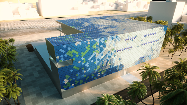 Pavillon France vue extérieure des tuiles photovoltaïques. © DR