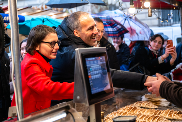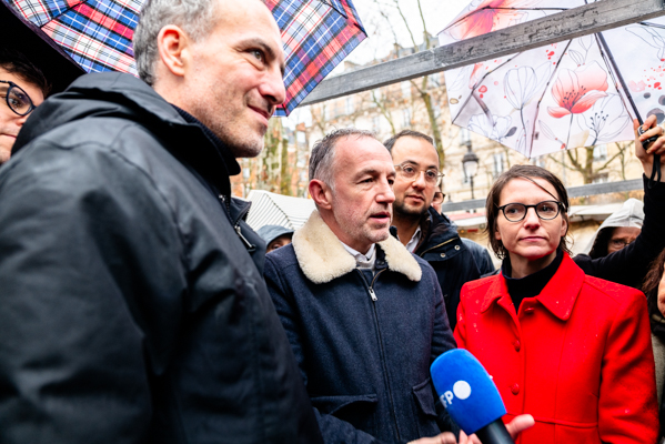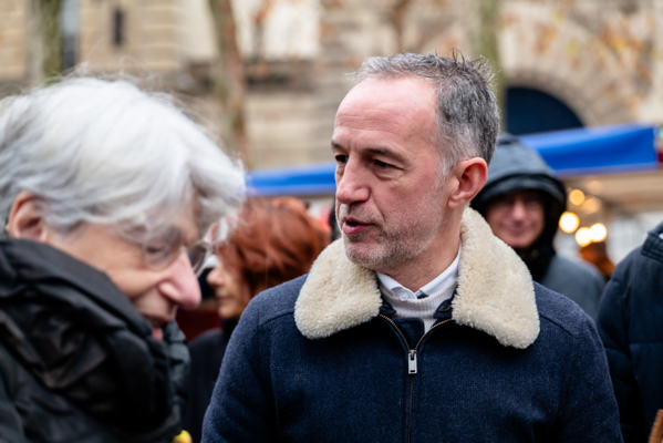 En marge d’une déambulation dominicale sur le marché de la place Monge, dans le 5e arrondissement de Paris, Emmanuel Grégoire, accompagné du leader de Place publique Raphaël Glucksmann et de représentants des différents partis de gauche réunis derrière sa candidature, a rappelé ses propositions phares et souhaité une campagne placée sous le signe du débat constructif et du dialogue républicain.
