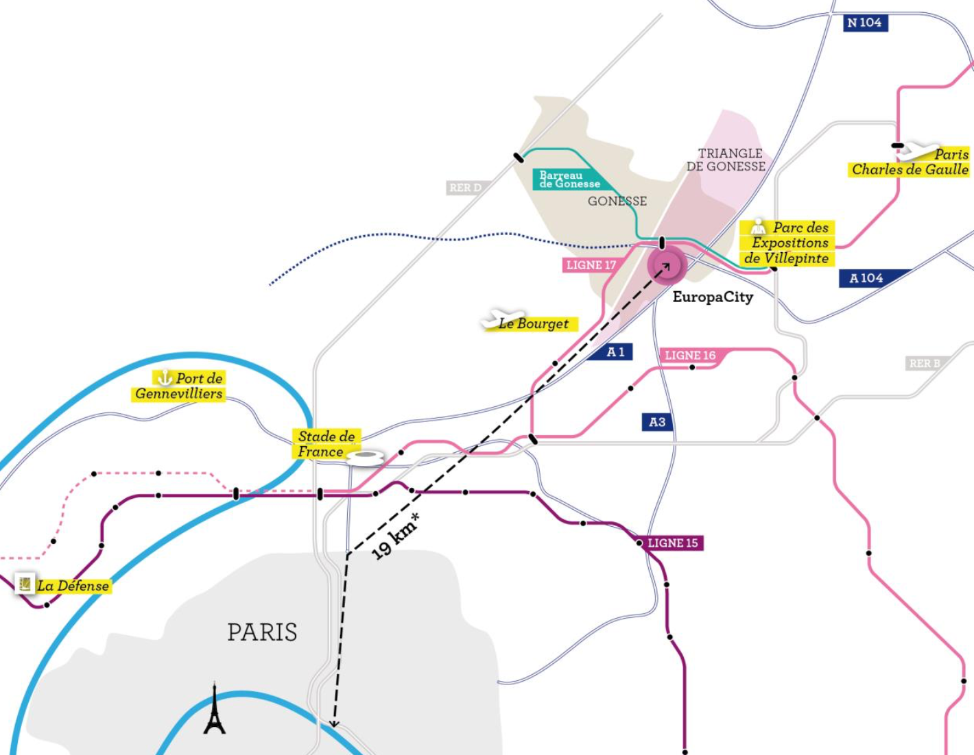 15 ha soumis à l’imagination des concurrents d’Inventons la métropole du Grand Paris seront également aménagés à côté d’EuropaCity. On connaîtra le lauréat de cette parcelle le 18 octobre prochain, lors de l’annonce de l’ensemble des finalistes du concours métropolitain. Par ailleurs, Grand Paris aménagement (GPA) aménagera, de l’autre côté de l’autoroute A1, l’ancien site de PSA, situé sur la commune d’Aulnay-sous-Bois. Une emprise de 100 ha, auquel sera adjointe une soixantaine d’hectares supplémentaires pour former un ensemble de 163 ha allant jusqu’à la gare d’Aulnay-sous-Bois. Un programme dont l’aménagement, qui débutera dès que l’Etablissement public foncier d’Ile-de-France aura acquis le site de PSA, sera coordonné avec celui de la ZAC du Triangle de Gonesse, a indiqué le président de GPA.