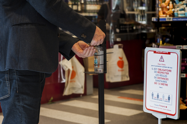 Le jeune responsable du Franprix de la rue Réaumur accueille les clients et leur rappelle l’obligation de se laver les mains avec du gel hydroalcoolique dès leur entrée dans les lieux.