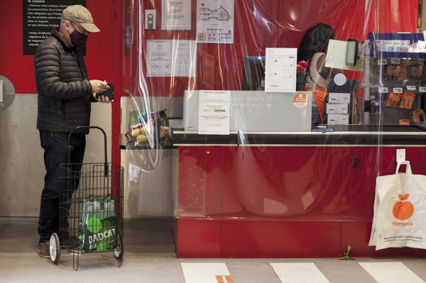 Mardi 17 mars, alors que les mesures de confinement ont été annoncées la veille, des bâches sont installées devant les postes de travail des hôtes et hôtesses de caisse du point de vente de l’enseigne Franprix, situé au 102 rue de Réaumur, dans le 2e arrondissement de la Capitale. « Nous avons servi de ‘magasin test’ pour la mise en place des mesures de distanciation physique, confie Quentin Hébert, responsable du magasin, des prestataires sont intervenus le 17 à 8h30 du matin pour installer des bâches séparant les clients des employés en caisse, et mettre en place des marquages au sol », poursuit-il, des mesures censées rendre visible la fameuse distanciation physique qui devait être appliquée par l’ensemble de la population pour se prémunir de la propagation du Covid-19.