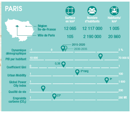 En tant que région métropolitaine, Paris dispose « d’atouts remarquables dans la transition urbaine », s’accordent à dire les auteurs de l’étude, notamment grâce à sa notoriété mondiale, sa culture urbaine et à des « mégaprojets » structurants en très grand nombre : JOP 2024, Grand Paris express, Plateau de Saclay pour ne citer qu’eux. Paris se classe quatrième sur l’indice de puissance globale derrière Tokyo, New York et Londres, grâce aussi à une qualité de vie et un PIB par habitant élevé. Enfin, la ville se situe au 23e rang pour son empreinte carbone sur 13 000 villes étudiées.