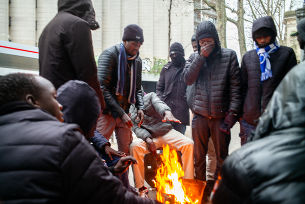 Migrants sans-abri se réchauffant autour d’un brasero, à Stalingrad, dans le 19e arrondissement de Paris, dimanche 28 décembre 2025. © Jgp