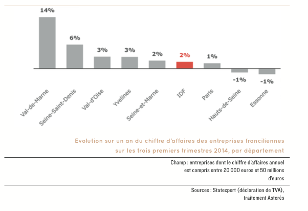Sur les trois premiers trimestres de 2014, le chiffre d’affaires des PME franciliennes a progressé de 2 %, contre + 1 % en 2012 (stable en 2013). L’activité a été la plus dynamique dans les départements de la petite couronne : + 14 % en Val-de-Marne et + 6 % en Seine-Saint-Denis. « Les Hauts-de-Seine (- 1 %) font figure d’exception du fait de la forte présence de services à haute valeur ajoutée en repli », indique l’Ordre des experts-comptables d’Ile-de-France, qui a présenté le 11 février 2015 la 1ère édition de l’Observatoire de l’économie francilienne, réalisé à partir de la base de données Statexpert des experts-comptables.