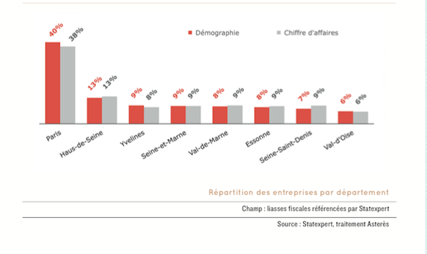Il prend en compte 11 000 sociétés franciliennes dont le chiffre d’affaires se situe entre 20 000 et 50 millions d’euros. Les commerces en représentent 22 % et 34 % du chiffre d’affaires, les activités spécialisées, scientifiques et techniques respectivement 17 % et 12 %, la construction 11 % des deux. Paris héberge 40 % des entreprises franciliennes et totalise 38 % de leur chiffre d’affaires. Le reste est à peu près équitablement réparti entre les sept autres départements franciliens à l’exception des Hauts-de-Seine qui concentrent 13 % des entreprises et des chiffres d’affaires.