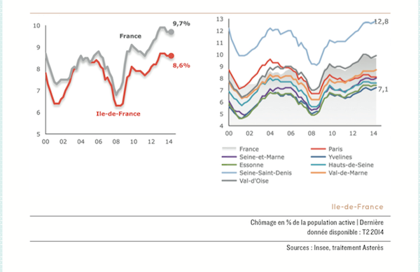 Ce contexte favorable a engendré une progression de l’emploi depuis l’été 2013, qui a retrouvé son niveau d’avant 2008. Ainsi, le taux de chômage en Ile de France atteint 8,6 % à fin 2014 contre 9,7 % en France. Toutefois, il existe de fortes disparités entre les huit départements puisque le taux s’élève à 12,8 % pour la Seine-Saint-Denis et 7,1 % pour les Yvelines.
