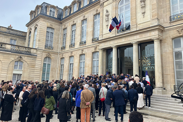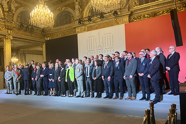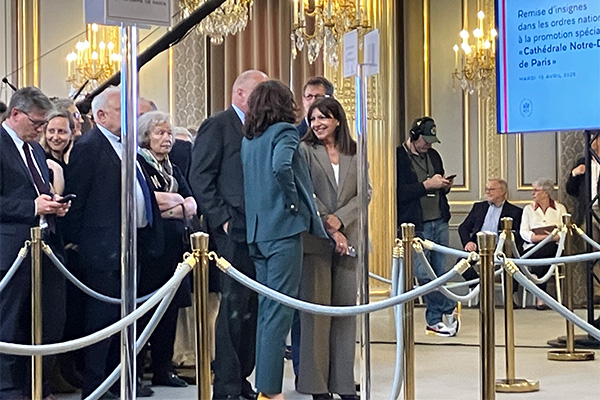 En présence des familles des personnes distinguées et de tout un aréopage de personnalités dont le chef d’état-major des armées Thierry Burkhard, le préfet de la région Ile-de-France Marc Guillaume, le préfet de police Laurent Nuñez, la maire de Paris Anne Hidalgo, le recteur de la cathédrale de Notre-Dame Olivier Ribadeau Dumas, le commandant de la Brigade de sapeurs-pompiers de Paris au moment de l’incendie le général Jean-Claude Gallet et son successeur le général Arnaud de Cacqueray, le président de l’établissement public Rebâtir Notre-Dame de Paris Philippe Jost, ainsi que de plusieurs membres du gouvernement dont le Premier ministre François Bayrou et la ministre de la Culture Rachida Dati, le président de la République a redit toute « la gratitude de la nation » aux récipiendaires.