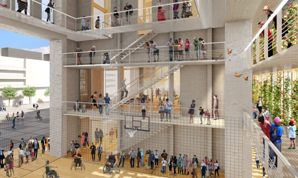 Un jeu d’escaliers et de passerelles desservira les divers espaces (galerie des énergies, atelier scientifique, studio des innovations, hub entrepreneurial, restaurant, serre, terrasse) qui fonctionneront indépendamment les uns des autres et pourront être mutualisés pendant un grand événement. Les quatre façades de l’ensemble s’ouvriront largement sur la ville. Au final, un espace capable où foisonne une très grande diversité d’activités et donc d’énergies sera ainsi créé.