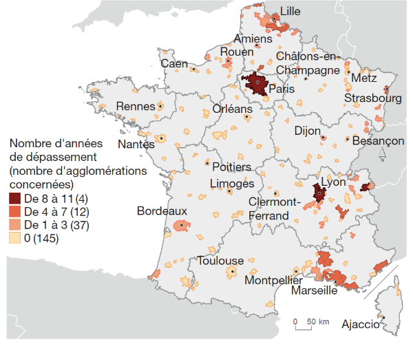 Si le CGDD constate une « baisse globale du nombre d’agglomérations en dépassement pour le NO2, les PM10 et l’O3 », cette amélioration « masque néanmoins des disparités géographiques » et 28 n’ont toujours pas respecté les normes en 2017. Plus précisément, cinq agglomérations enregistrent chaque année des dépassements de normes pour les NO2, à savoir Paris, Lyon, Marseille-Aix-en-Provence, Montpellier et Strasbourg.