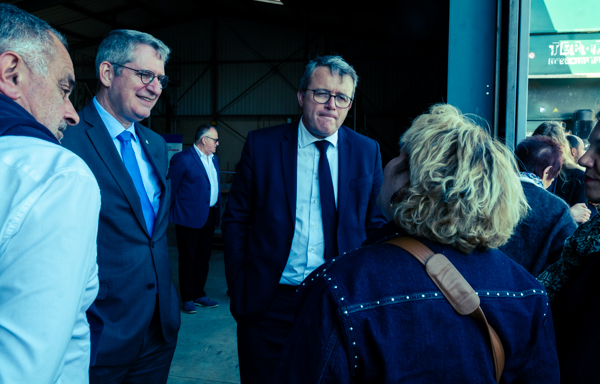 Le président du conseil départemental de l’Essonne François Durovray, s’entretient avec les représentants de GRDF, Santa Orsini, directrice régionale Ile-de-France et Stéphane Gorisse, directeur du développement des gaz verts © Jgp