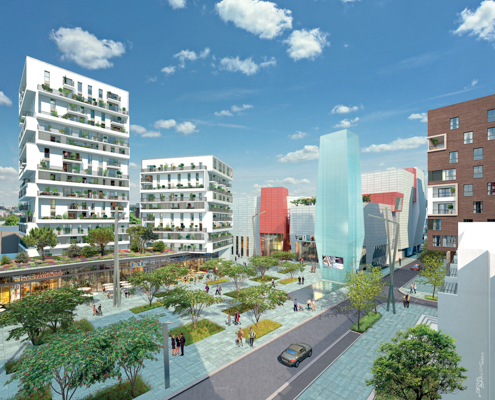 Ce quartier mixte (logements/commerces/bureaux) réalisé avec les architectes Elizabeth et Christian de Portzamparc, vise donc à établir un lien entre ces zones éparses, en créant une nouvelle centralité. « La singularité de ce projet provient du fait qu’il repose sur la complémentarité des métiers d’Altarea Cogedim, qui nous permet d’intervenir sur sa globalité », souligne Frédéric Brunel. Autre singularité, le centre des congrès, prévu en son sein, dont l’investissement est pris en charge par le Crédit agricole, sera confié à un opérateur privé, en cours de recherche.