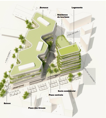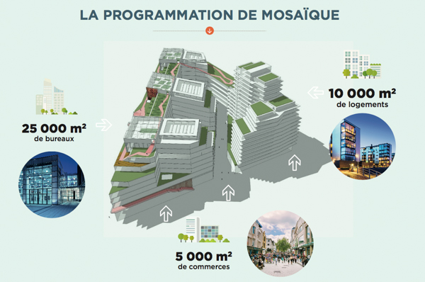 Deux projets ont été retenus et sont soumis à l’avis des habitants jusqu’au 15 septembre. Il s’agit d’une part de « L’ilot mosaïque » proposé par Linkcity Ile-de-France avec l’urbaniste TGTFP, l’investisseur AXA Reim et le think tank Fing, ainsi qu’une multitude de partenaires, et d’autre part du projet « Les Groues – Pôle gare » soumis par le Groupe Pichet avec l’investisseur-promoteur Foncière des régions et l’architecte urbaniste Uban Act. « Ouvert et traversé », L’ilot mosaïque se présente comme un ensemble compact aux multiples décrochés et nombreuses terrasses végétalisées. Chaque niveau du bâtiment à énergie positive remplit une fonction : les commerces (5 000 m2) et espaces de co-working en strates basses, les bureaux (25 000 m2) dans les étages intermédiaires et les logements (10 000 m2) en hauteur.